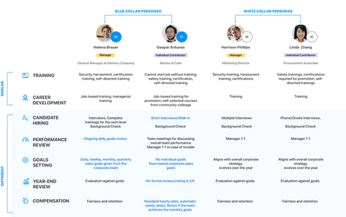 Designing an individualized experience starts with a thorough consideration of each persona. At the beginning of this project, I spent a lot of time figuring out the blue-collar and white-collar differences and their needs with SuccessFactors.